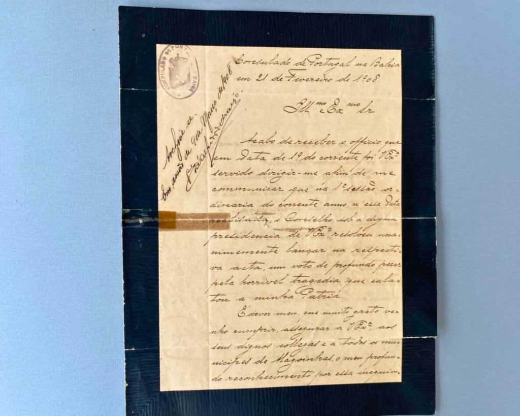 A Moção está registrado num livro de posse do Memorial da Câmara Municipal de Alagoinhas, bem como o livro de correspondências recebidas em 1908, ano da tragédia vivida por Portugal.